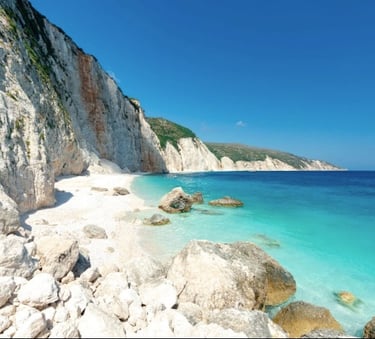 We cruise towards the breathtaking White Rocks Beach, where dramatic white cliffs meet crystal-clear turquoise water, perfect for swimming, snorkelling, or simply jumping straight from the boat into the Ionian Sea. We then stop at the peaceful Vardiani Island for a relaxing lunch break, surrounded by untouched nature and calm, clear waters.